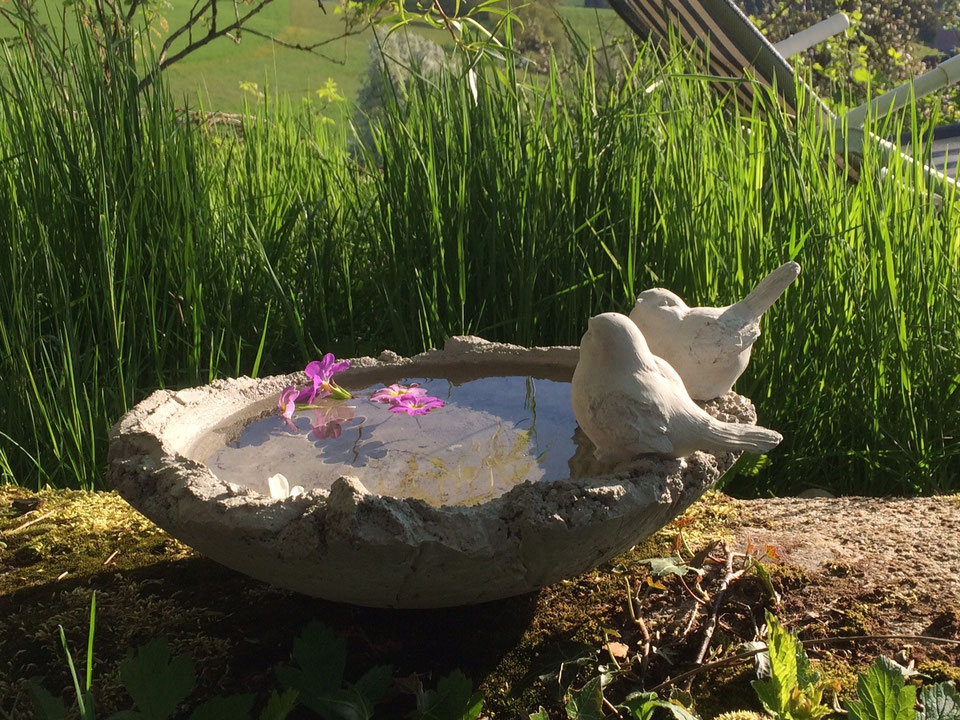 Du giesst mit Hilfe von vorhandenen Formen 1-2 kleine Vögel. Mit Schnellbeton formst du anschliessend eine Vogeltränke. Nach dem Erhärten befestigst du die Vögel. Nach Wunsch kann die Vogeltränke auf einem Armier-Eisen befestigt werden.