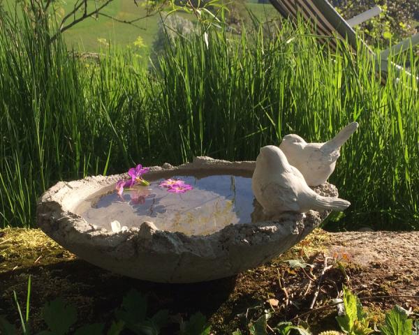 Du giesst mit Hilfe von vorhandenen Formen 1-2 kleine Vögel. Mit Schnellbeton formst du anschliessend eine Vogeltränke. Nach dem Erhärten befestigst du die Vögel. Nach Wunsch kann die Vogeltränke auf einem Armier-Eisen befestigt werden.